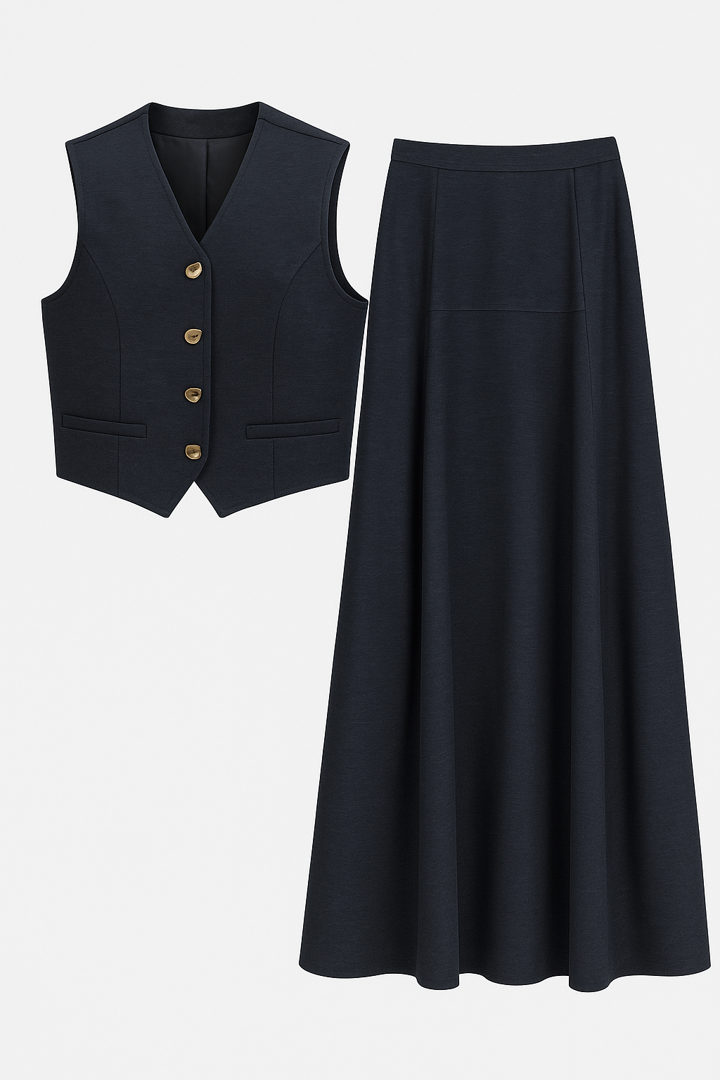 Елегантен дамски елек с дълга пола в син цвят, наподобяващ деним стил. Изработен от мек материал, който осигурява комфорт през целия ден. Практичен дизайн с ластик отзад на талията и цип отстрани за лесно облекло. Издутата част за осигуряване на пълноценно прилягане. Доставен от Испания.