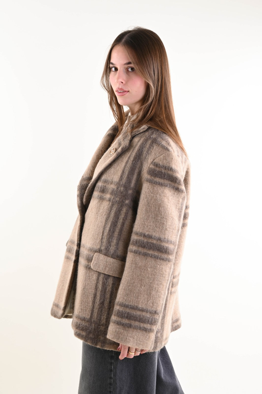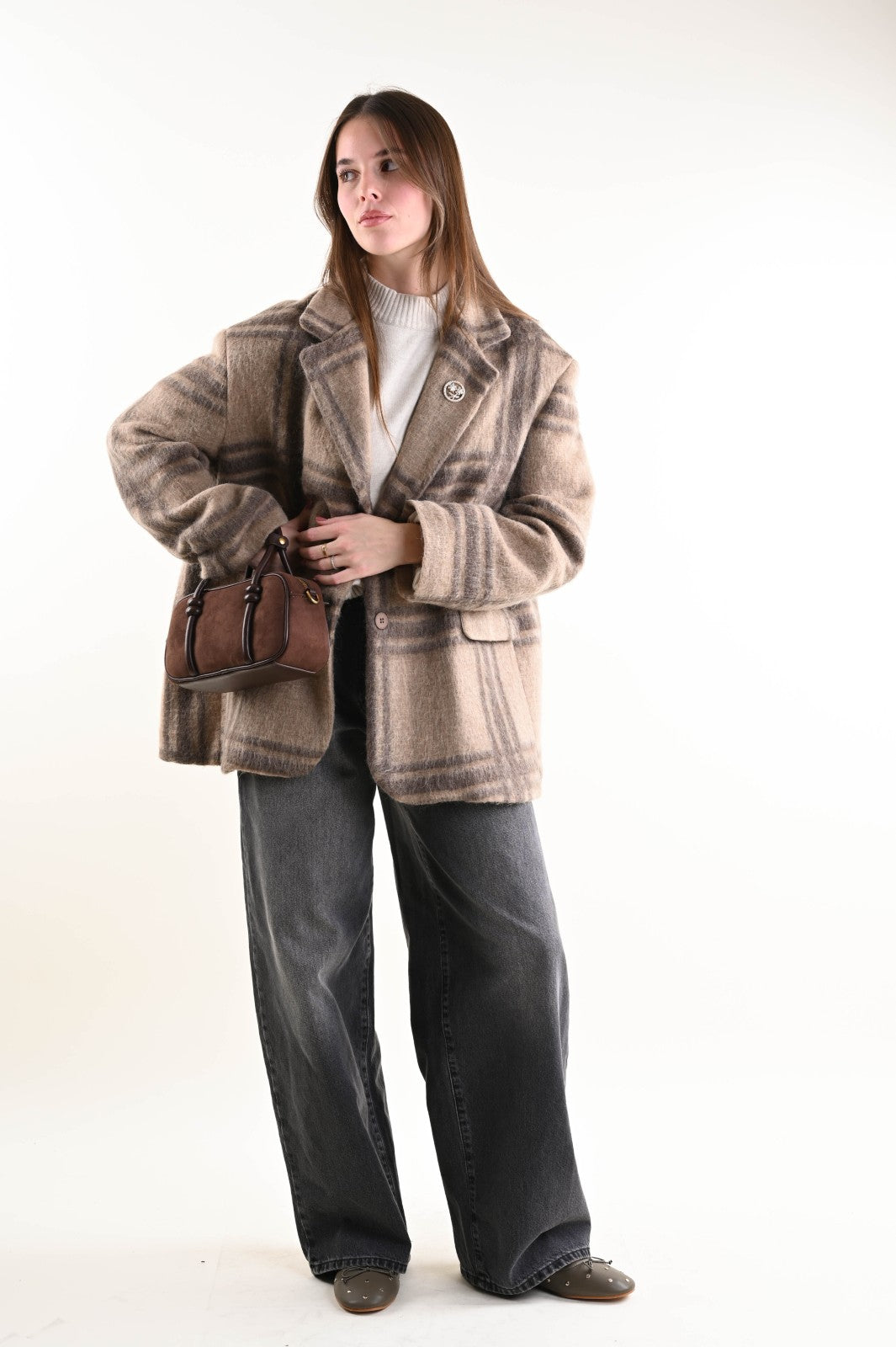 Палто от смесена вълна с мотив на каре, характеризиращо се с класически ревери и закопчаване с две копчета, интегрирана брошка. Правият крой и мекият текстил го правят елегантно и удобно, перфектно за студения сезон. Идеално за комбиниране с ежедневни или по-изискани визии, добавя нотка на вечен стил към гардероба.